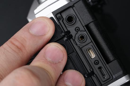 机身侧面接口处,分别是音频输入麦克风接口、快门线接口,音视频输出HDMI接口和Micro USB数据&充电接口。