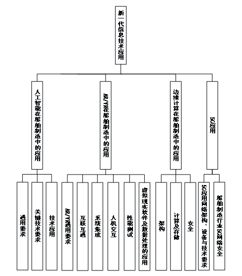 主要包括船舶总装建造场景的数字化描述与定义标准、知识库构建的标准、数据驱动性能评估等通用要求标准;船舶总装建造过程中现场数据采集,数据分析与挖掘,智能决策和协同控制等人工智能关键技术要求标准。